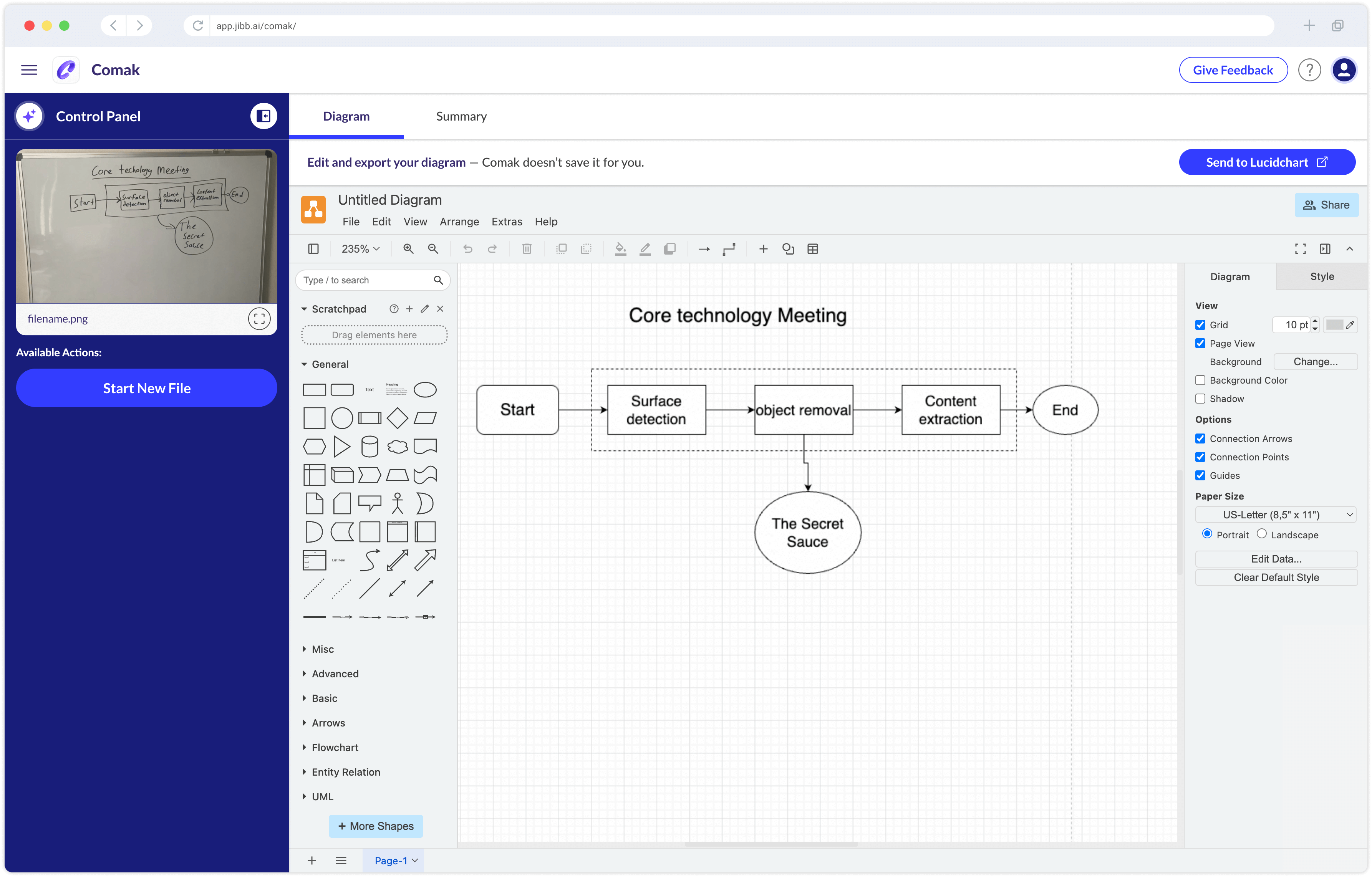 The early access version of Comak specializes in generating hand-drawn diagrams for Lucidchart. Future iterations of Comak will be able to recognize more formats and be integrated with other workflows.