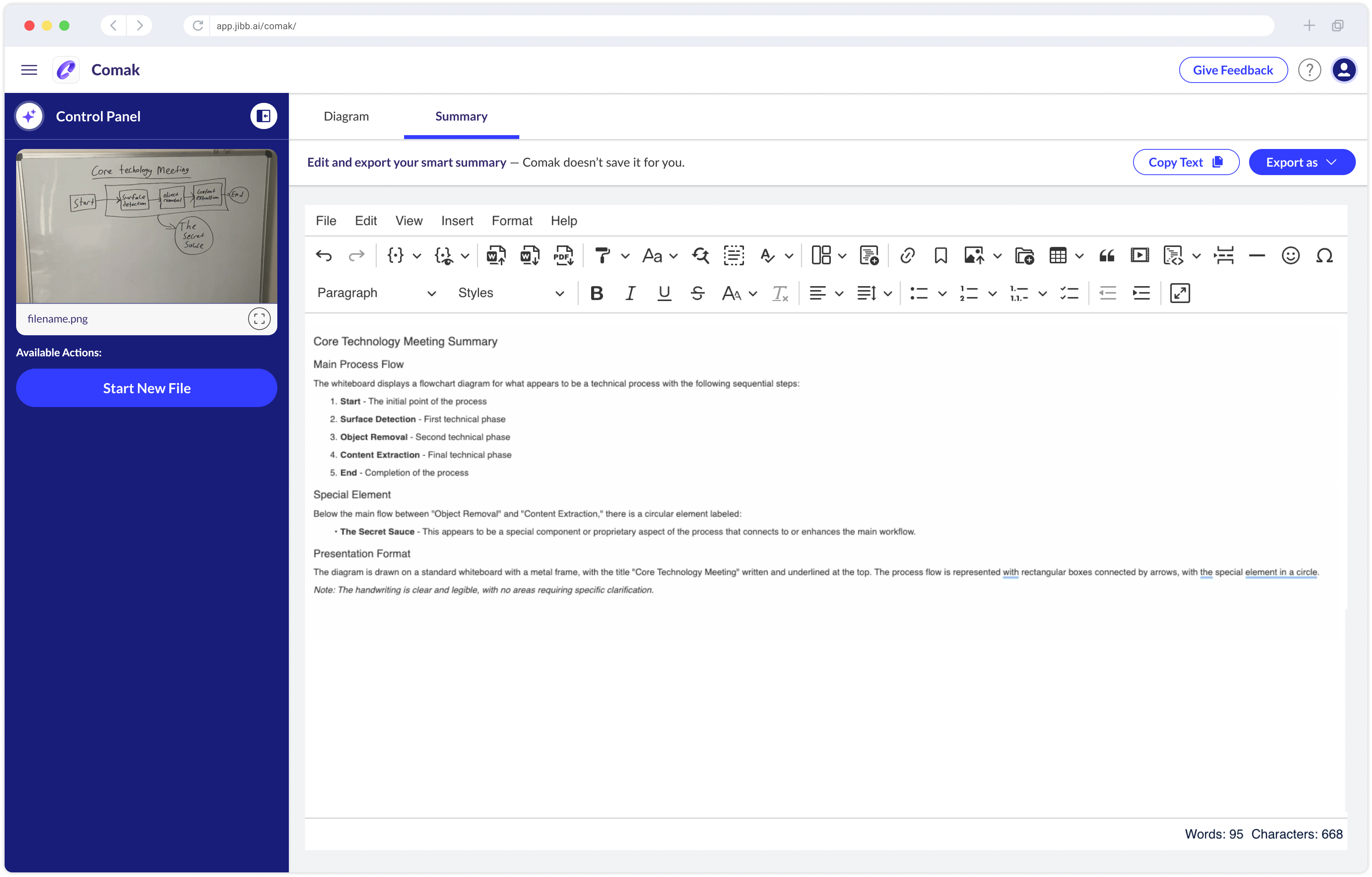 Simply upload a photo of your hand-drawn content from any whiteboard or paper. Comak will analyze it and generate a smart summary or digital diagram to export as a PDF or distribute to your workflow.