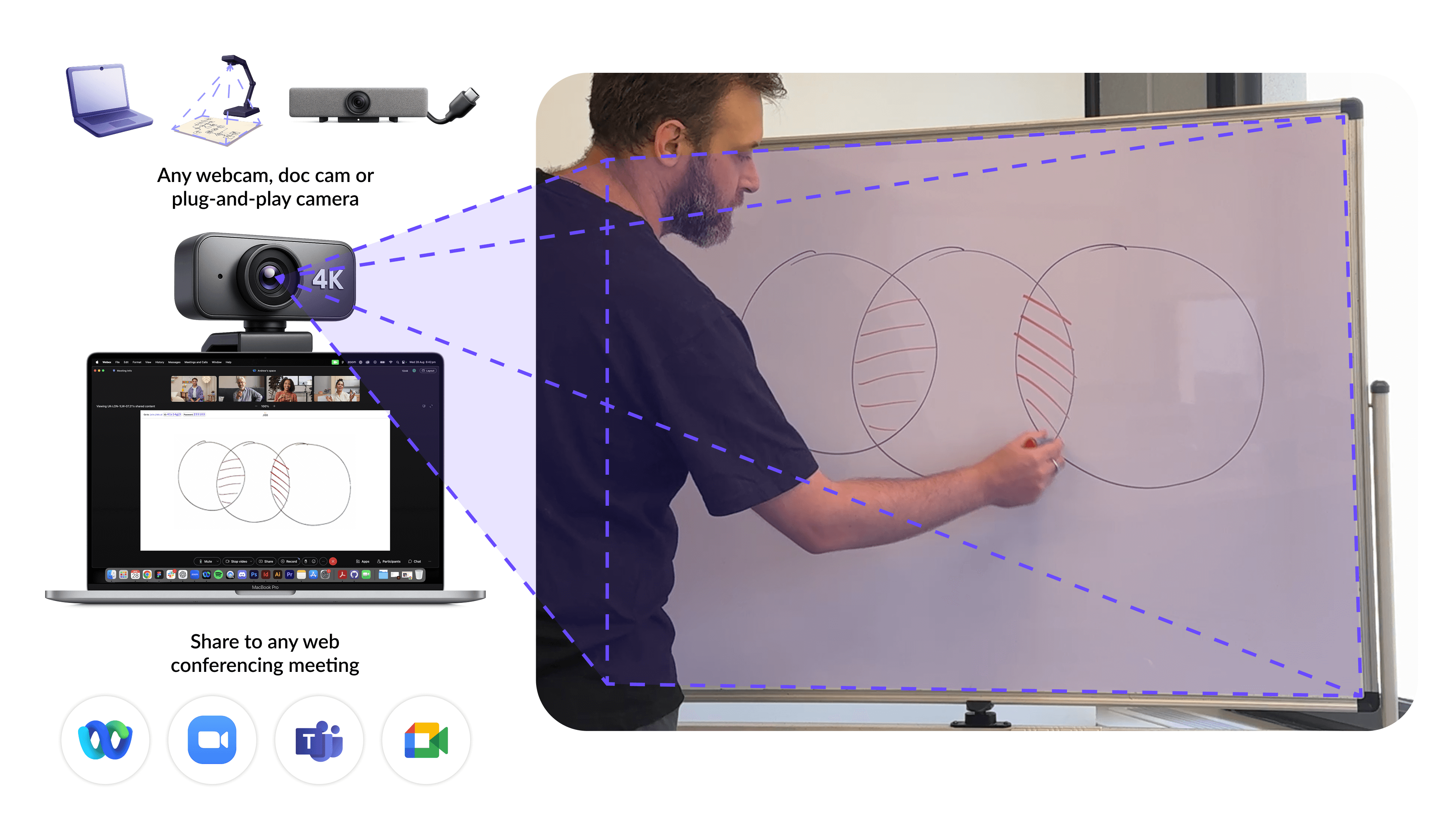 Use any meeting room BYOD video bar or device that connects to your laptop via USB to digitize and share the board.