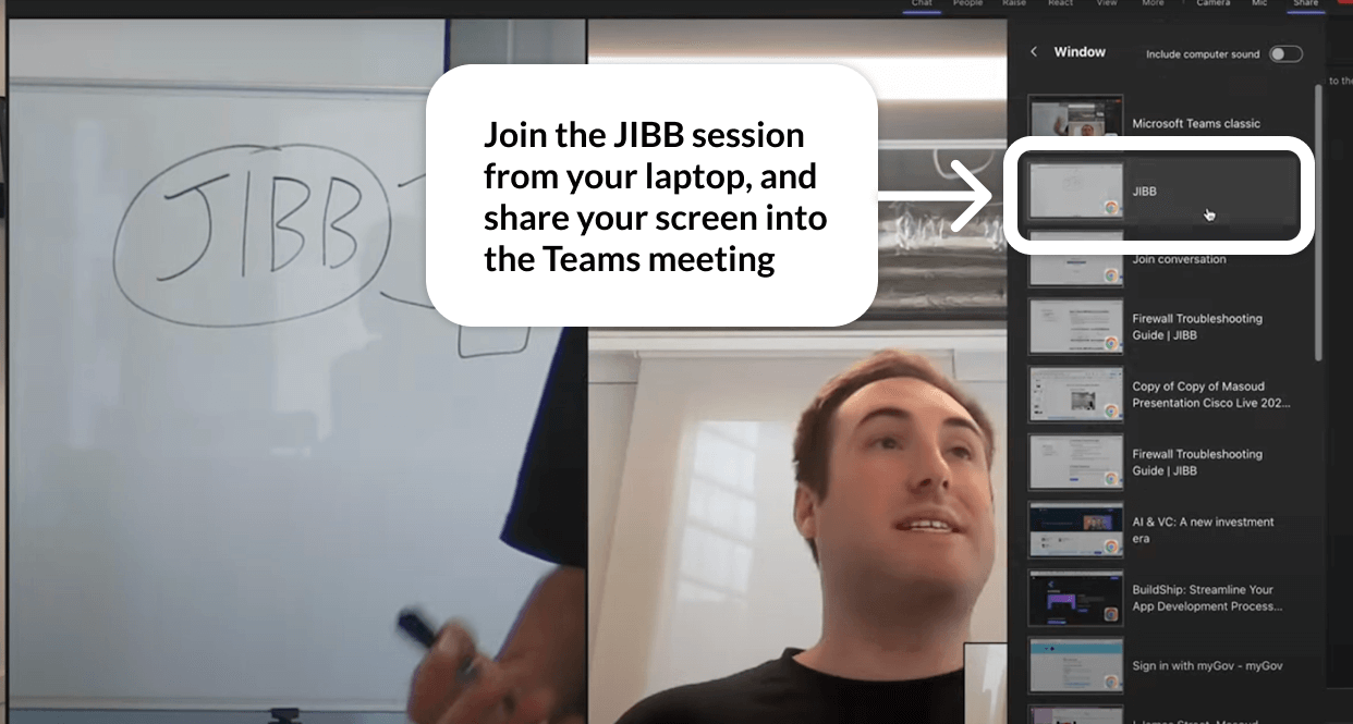 Share the JIBB Session from a separate device in Teams.
