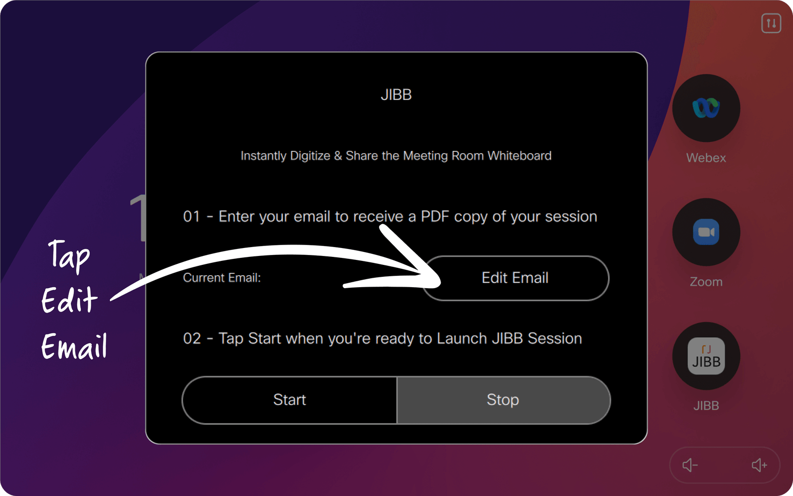 Before you start your JIBB Room session, enter your email address so JIBB can send you a PDF copy of your whiteboard content after your session ends.
